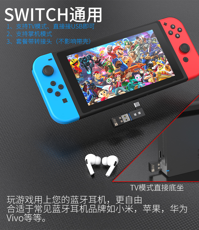 4、PS4,PS4 PRO,PS5,SWITCH(TV模式和掌機模式可以拍套餐);兼容常見藍牙耳機,比如蘋果、小米、華為或其它小眾品牌的
