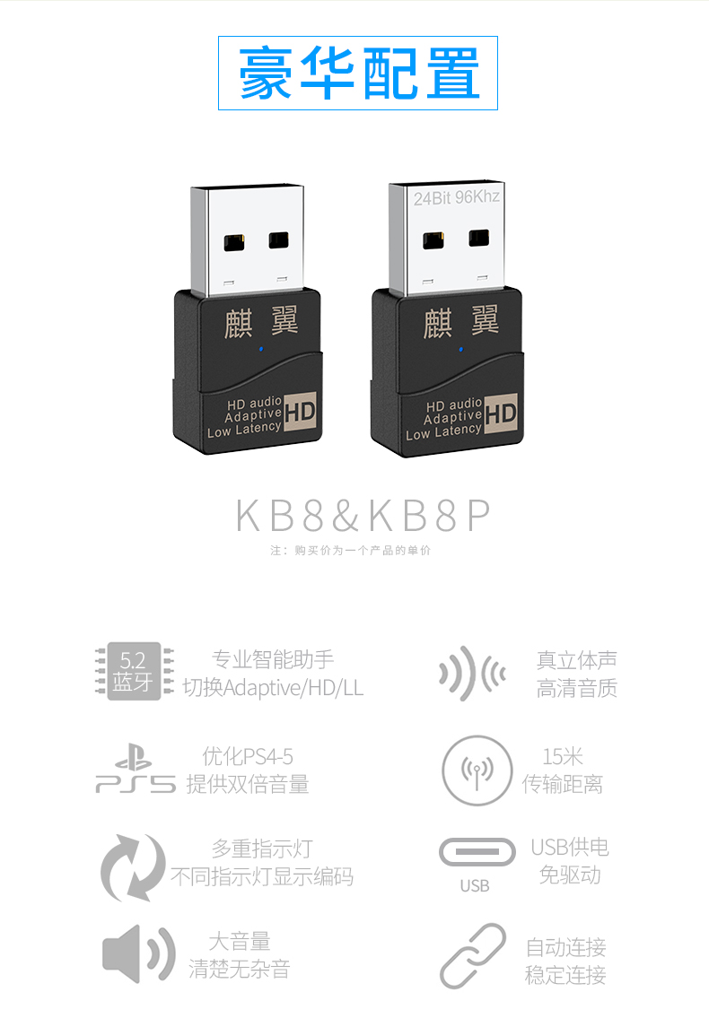 麒翼藍牙5.2發射器24Bit 96Khz適配器免驅動QCC3040芯片Aptx Adaptive KB8P