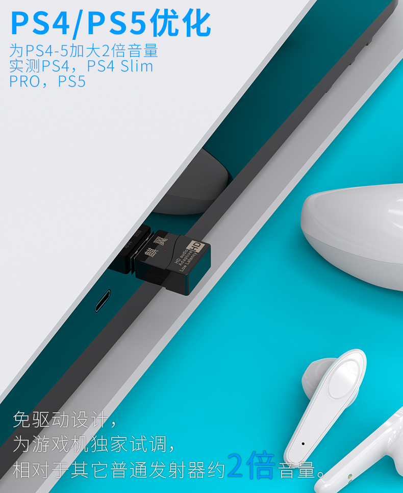 3、專為PS5優化音量,相對于普通藍牙發射器音量約大1.5倍,解決音量小問題;